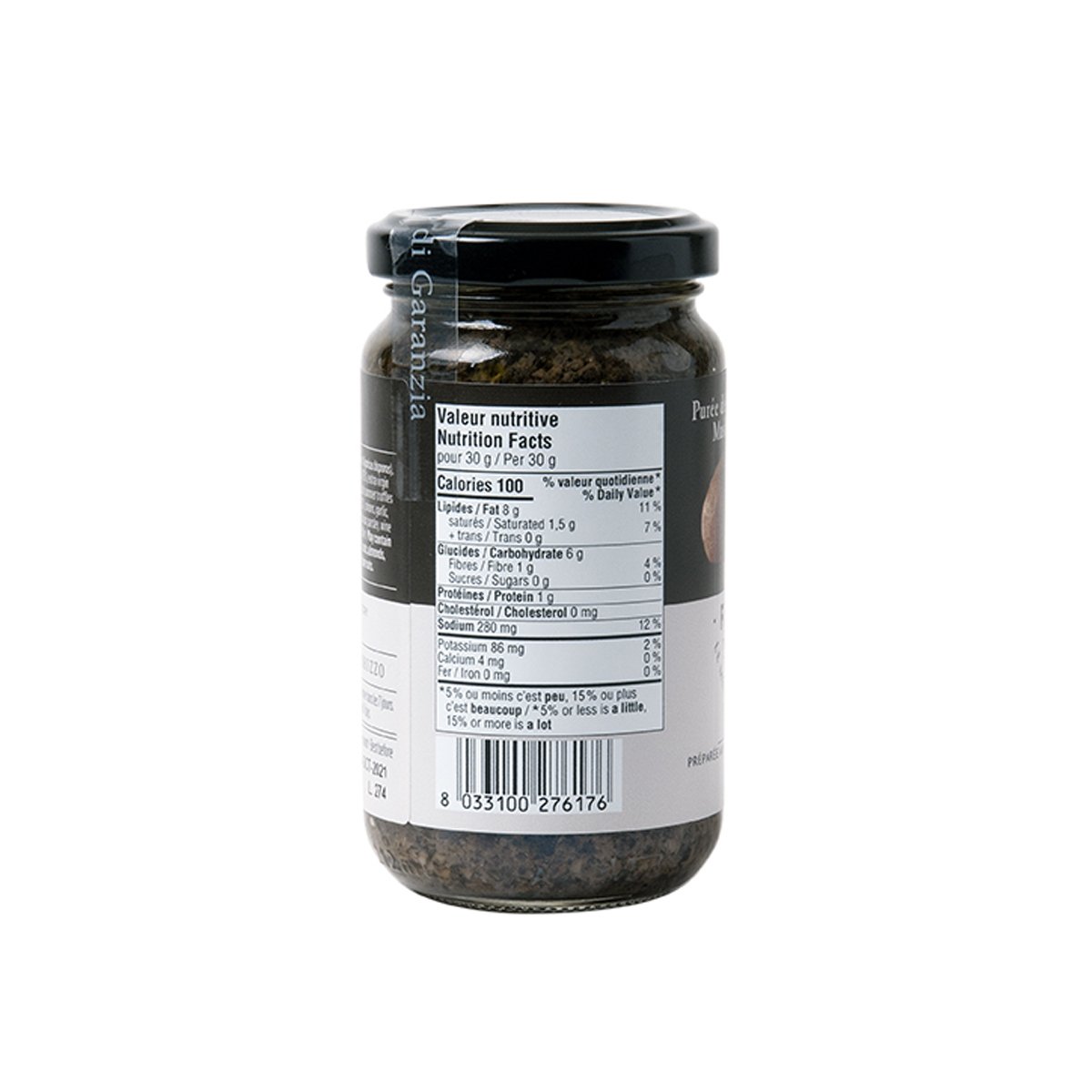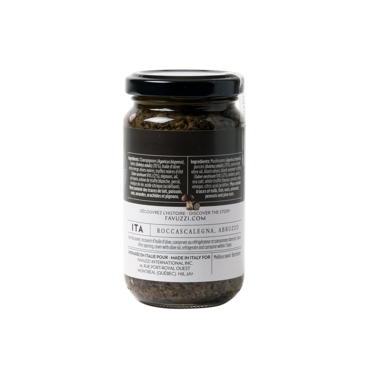 Mushrooms (Agaricus bisporus) and Boletus (Boletus edulis) 70%, Extra virgin olive oil, Black olives, Summer truffles (Tuber æstivumVitt.) 2%, Oignon, Garlic, Sea salt, White truffle flavour, Parsley, Wine vinegar, Acidifier: citric acid.
