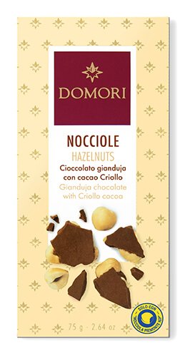 Ingrédients: Chocolat au lait et noisettes gianduja 80 % (solides de cacao 35 %. Sucre, pâte de noisettes du Piémont, beurre de cacao, pâte de cacao (dont pâte de cacao Criollo 4,7 %), lait en poudre 10 %, émulsifiant : lécithine de tournesol), noisettes du Piémont 20 %.