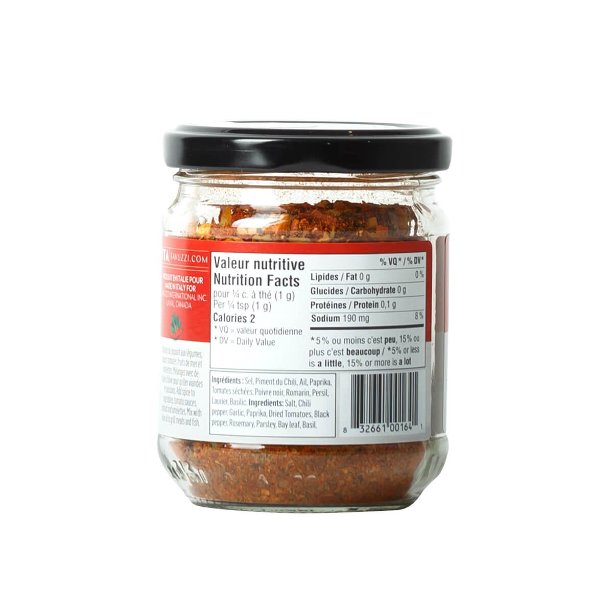 Sel, Piment chili, Ail, Paprika, Tomates séchées, Poivre noir, Romarin, Persil, Laurier, Basilic.